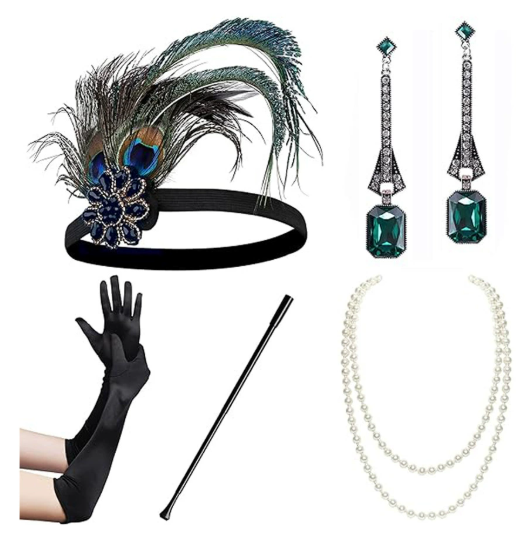 Product Name 1980s Gatsby party dress and suit, green peacock feather headdress, and boutonniere headband accessories