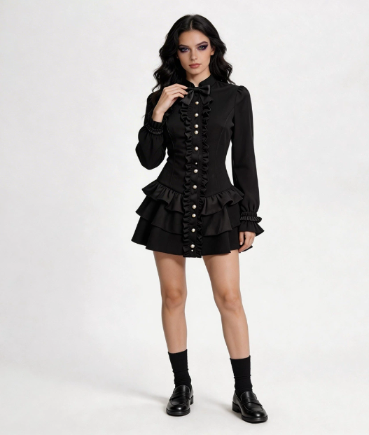 Product Name Black Gothic Dress, Halloween Retro Vampire Cosplay, Renaissance Long-Sleeved Dark Mini Skirt