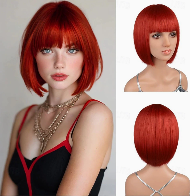 Product Name Bob short straight hair red wig with bangs, synthetic fiber heat-resistant red wig, 12 inches, everyday style.