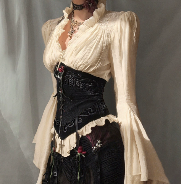Dark V-neck court-style long-sleeved top, 2025 new gothic style fashion retro shirt for women. #Q-98