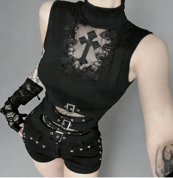 Dark-themed basic versatile sleeveless top, 2026 new gothic style hollowed-out cross top for women. #Q-161