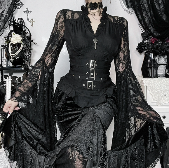 Dark-themed black V-neck lace-trimmed top, 2026 new gothic style slim-fitting top for women. #Q-163
