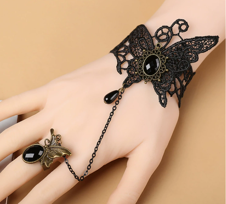 European and American retro court gothic butterfly flower lace bracelet with crystal setting and ring.