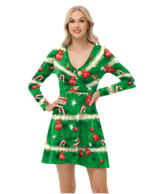 New European and American style sexy dress, Christmas dress, digital print V-neck autumn long-sleeved dress for women. #Q-19