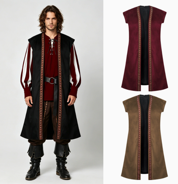 Product Name New medieval-style faux suede long vest, Halloween pirate retro coat, stage performance costume.